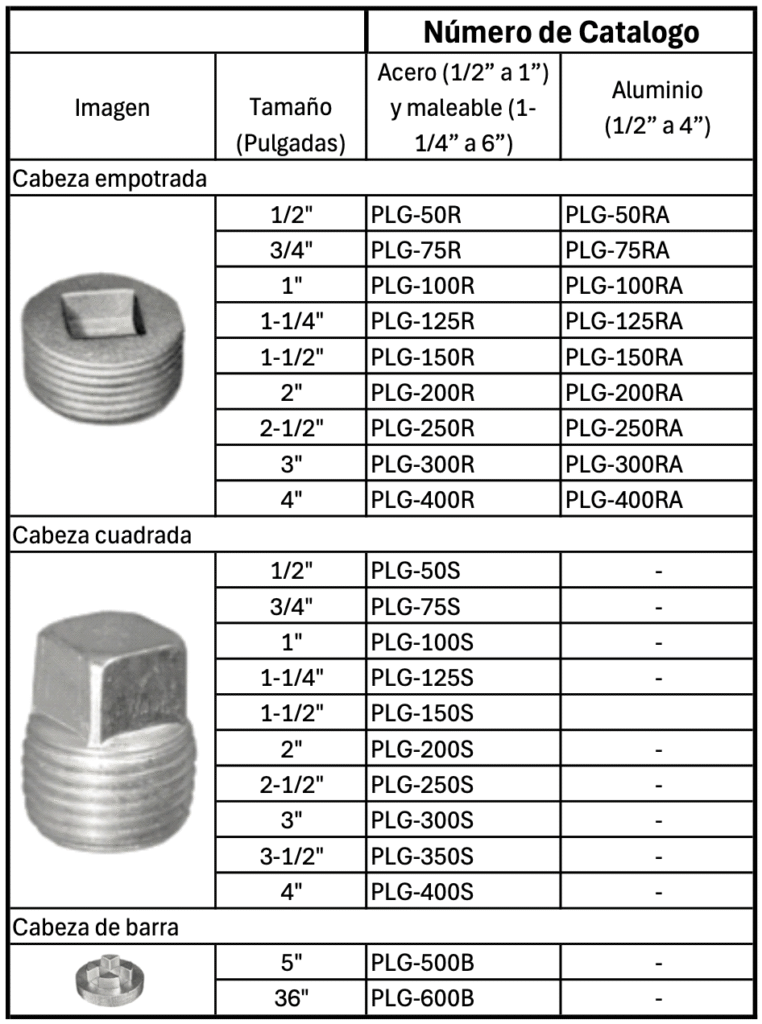 * Tapones PLG: de hierro maleable, acero o aluminio sin cobre (4/10 o 1% máx.).